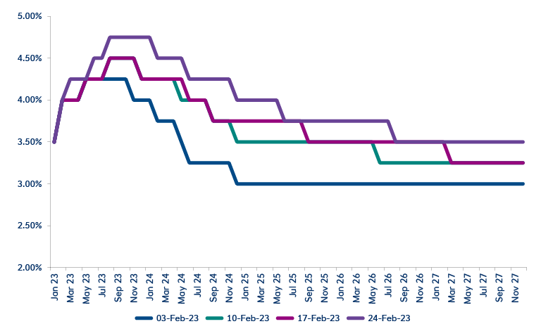 Implied rate expectations inched up to 4.75% in the week to 24 February